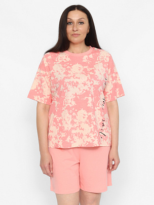 Комбинированная пижама из футболки и брюк. Футболка набивная, небольшого объёма, длиной до линии бёдер, с коротким рукавом. Горловина обработана притачной бейкой из рибаны с лайкрой. Прямые брюки умеренного объёма выполнены из гладкокрашеного полотна. Цельнокроенный пояс обработан плоским швом вподгибку с одновременным прокладыванием резинки.