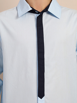 Рубашка классическая, полуприталенного силуэта, с длинным рукавом рубашечного покроя, с притачными манжетами, с застегивающейся шлицей рукава. Воротник обтачной с притачной стойкой. На центральной застежке расположена декоративная вставка в виде галстука.
