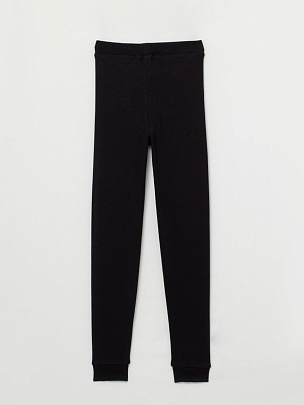 Кальсоны из рибаны с эластаном и начесом с изнаночной стороны, с клиновидными вставками спереди. Притачной пояс и манжеты по низу ножек выполнены из рибаны с эластаном. В пояс вставлена резинка. Кальсоны без боковых швов.