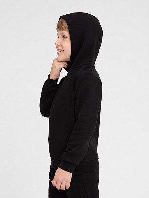 Толстовка для мальчика с капюшоном и карманами в боковых швах. Манжеты и пояс из эластичной рибаны. Внизу на полочке декоративная силиконовая нашивка.